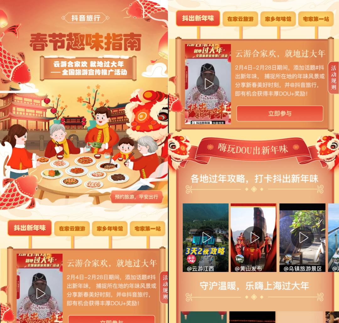 “用戶參與度廣、行業覆蓋度大”是抖音相關負責人給出的關鍵詞。春節期間,抖音推出“抖出新年味”話題活動,有獎征集“曬所在地年味,秀本地遊攻略”的短視頻内容。該話題活動共獲得35.6萬網友投稿,包括@房琪kiki、@幻想家japaul等上千位抖音旅行人氣創作者。此外,@雲遊江西、@黃山發(fā)布、@大理旅遊等200多家地方文旅單位、景區、航空公司等文旅行業官方賬号也參與了話題活動,在春節期間持續發(fā)布當地春節活動、旅遊美景等話題相關内容。